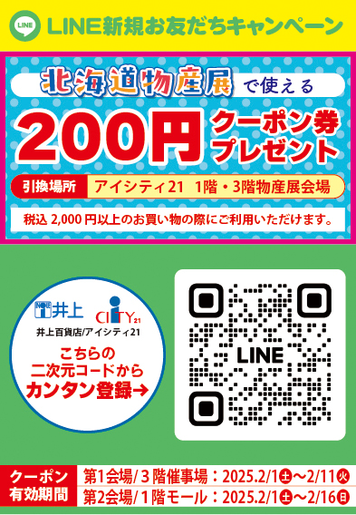 お友だち登録で、北海道物産展で2,000円以上のお買い上げで1店舗1会計1枚お使いいただけるクーポン引換券をプレゼント